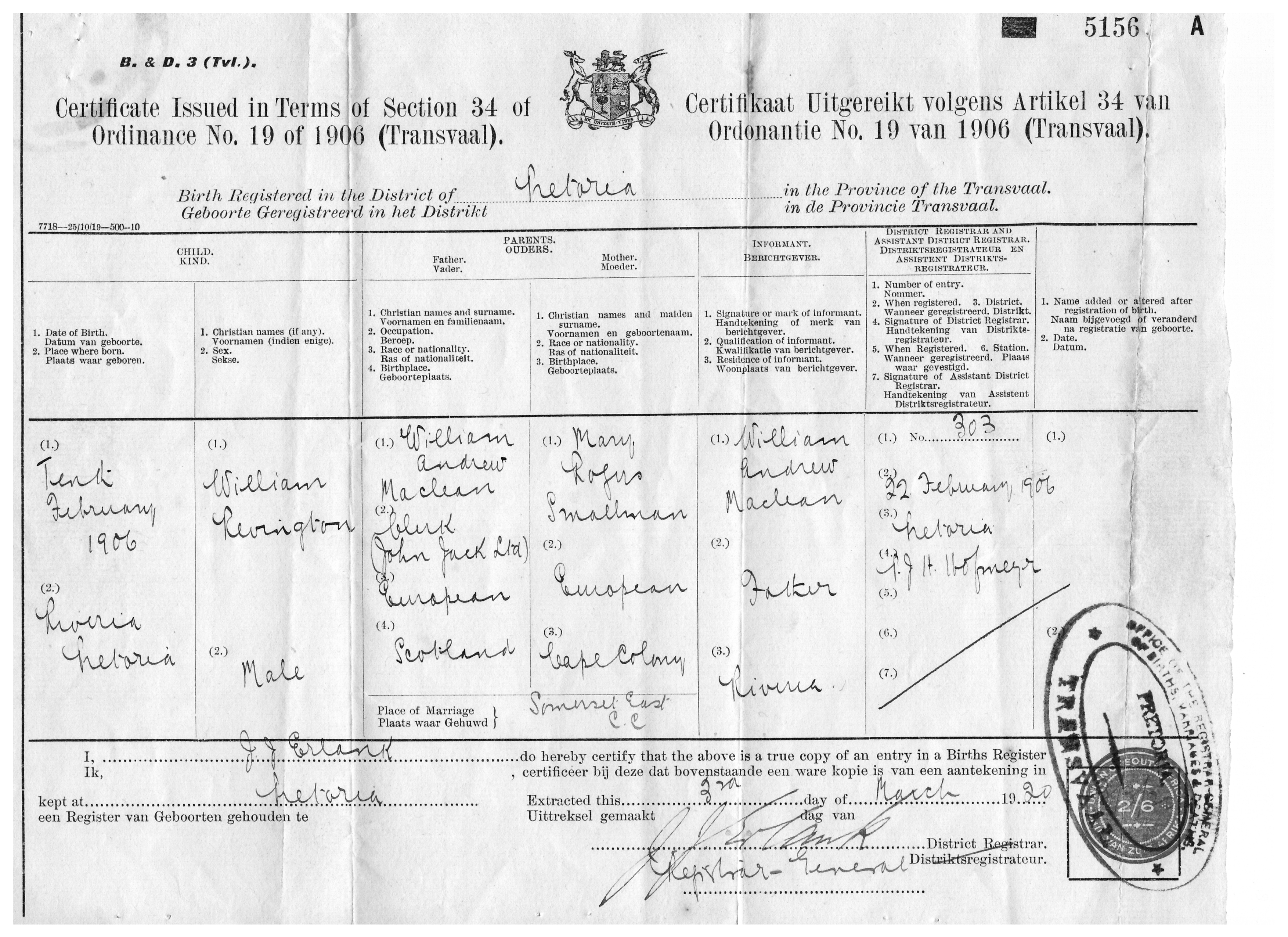 William Revington Maclean birth certificate Pretoria 1906