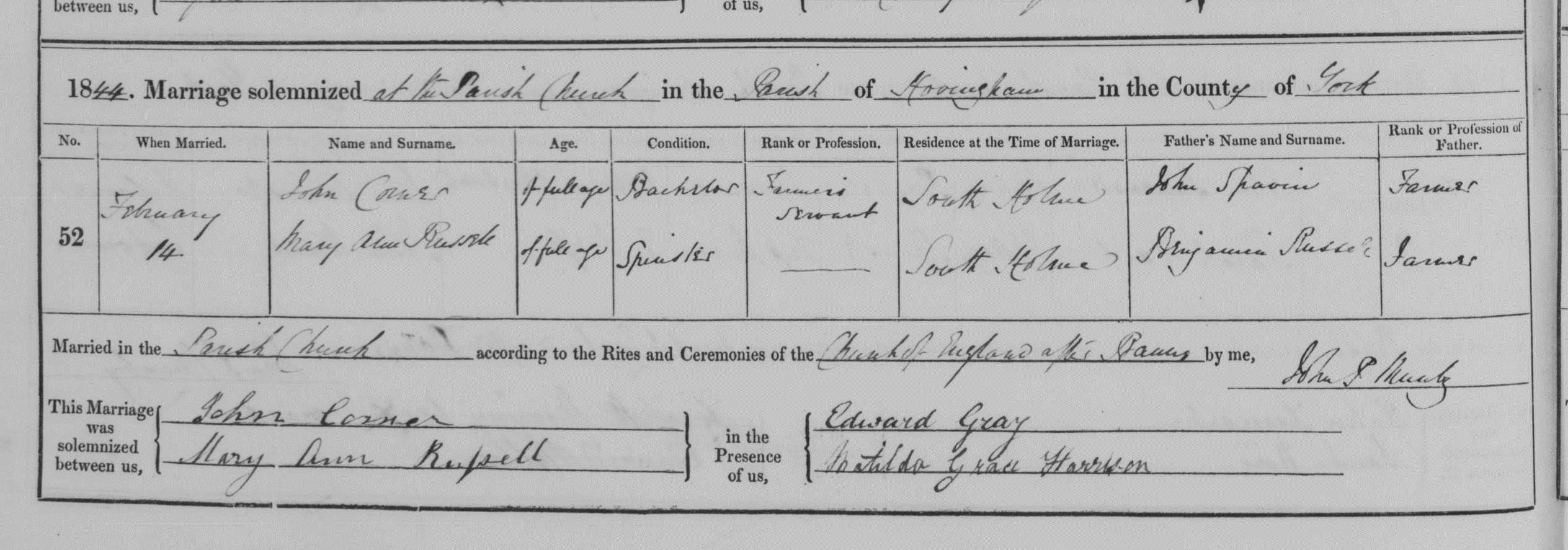 John Corner and Mary Ann Russell marriage